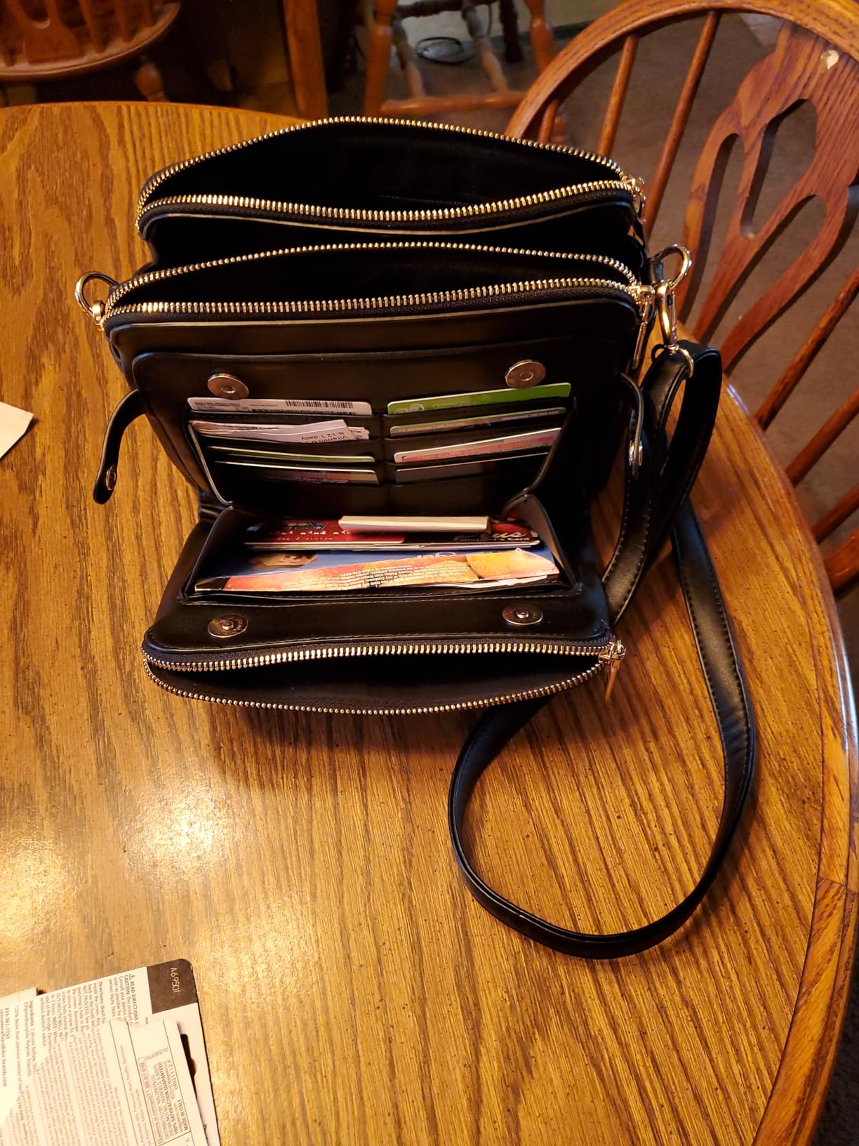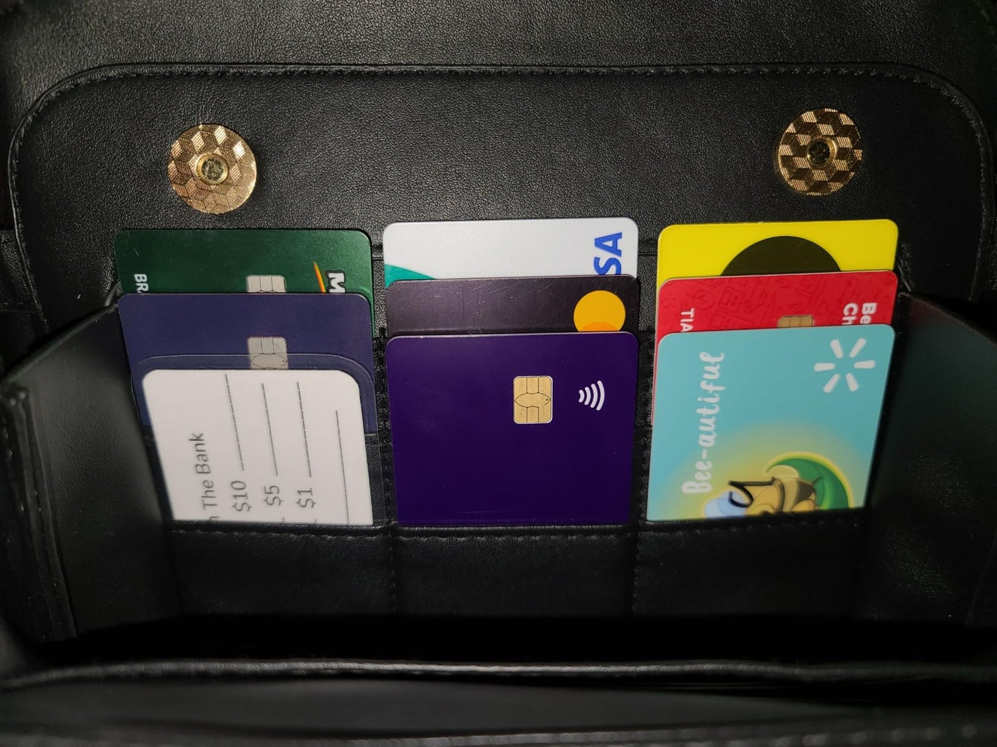 I got this for my wife, this is her review: "This is my first classic black purse and i love it. it's the perfect size for everything i may want and need. the front lap functions as a wallet and the buttons clasp super strong without me even trying, love that magnet power. the middle sections is perfect for my phone and the back sections functions as a cosmetic section if i needed to bring cosmetics somewhere. is lightweight and it gives NYC simplicity."
